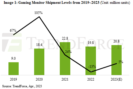 TrendForce’s latest research revealed that shipments of gaming monitors have seen their first decline since 2016 due to high inflation, resulting in only 19.8 million units being shipped in 2022 for a 13% YoY decline. TrendForce predicts that demand should recover in 2023 however, jumping back up to 20.8 million units—an increase of 5% YoY. This recovery will mostly be driven by three factors: First, a number of brands are replacing their 75Hz models with 100Hz models. Second, the 2023 Hangzhou Asian Games is scheduled to take place in the third quarter, where Esports is set to be one of the competing categories. This will help drive up demand for gaming products. Lastly, China has finally begun lifting COVID restrictions, which means demand for Internet cafes should gradually recover.