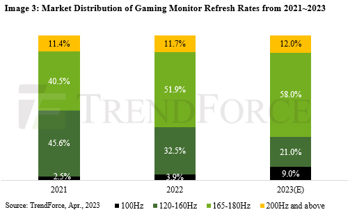 In 2022, 165–180Hz gaming monitors had the highest market share at 51.9%, followed by 120–160Hz monitors at 32.5%, 200Hz and above at 11.7%, and finally 100Hz at 3.9%. TrendForce predicts that the market share of 165–180Hz and 100Hz monitors will increase significantly in 2023. It is believed that 165–180Hz monitors will eventually absorb the market share of 120–160Hz monitors as the price difference between the two ranges is not large. Furthermore, it is expected that 100Hz monitors will come to mostly replace 75Hz gaming monitors, and TrendForce predicts that their market share will increase 5.1 percentage points to 9% in 2023 (the market share of 100Hz monitors mentioned in this article only accounts for gaming monitors).