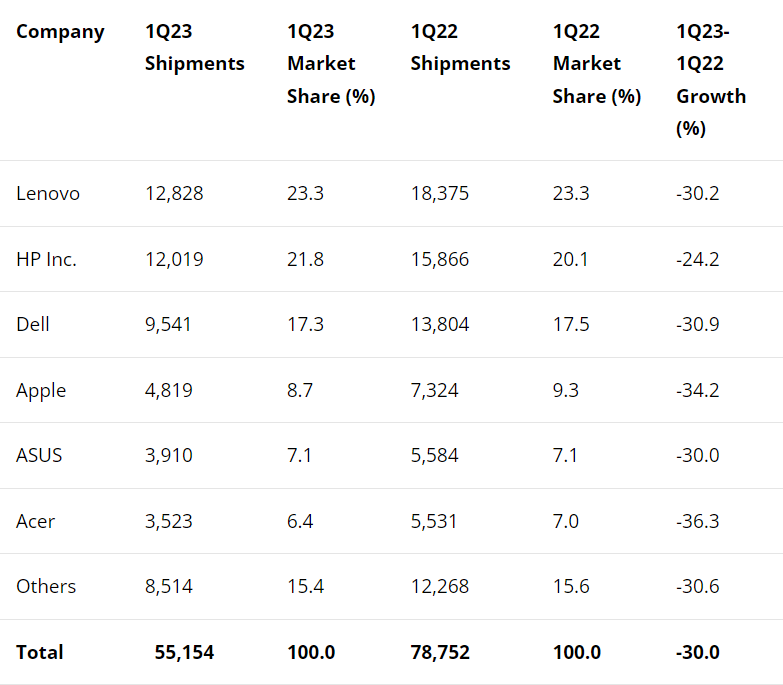 The top vendors in the worldwide PC market remained unchanged in the first quarter of 2023, with Lenovo maintaining the No. 1 spot in shipments with 23.3% market share (see Table 1).