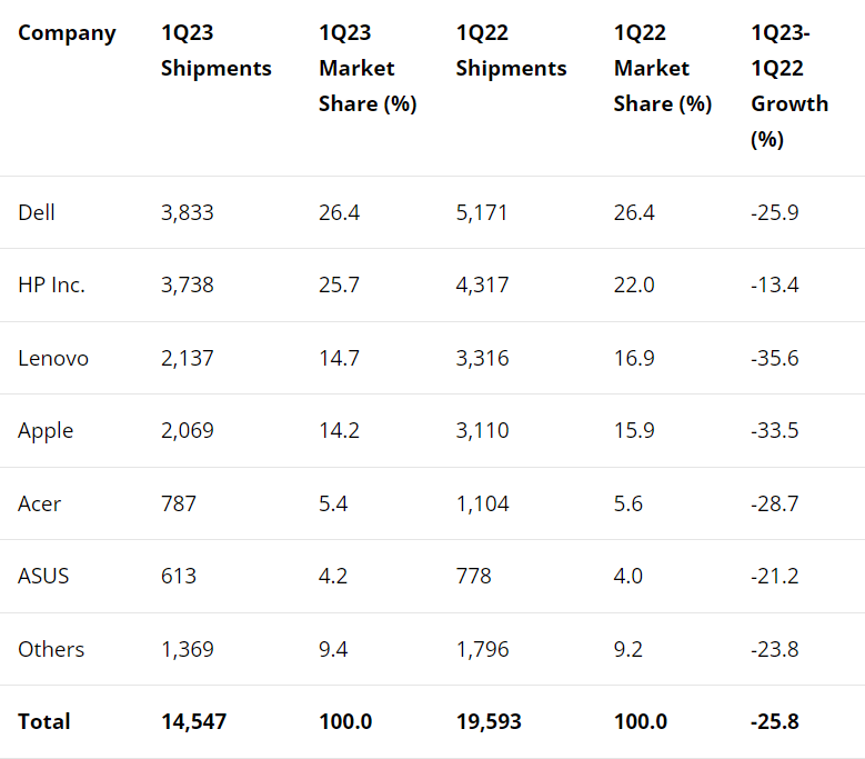 Table 1. Preliminary Worldwide PC Vendor Unit Shipment Estimates for 1Q23 (Thousands of Units)