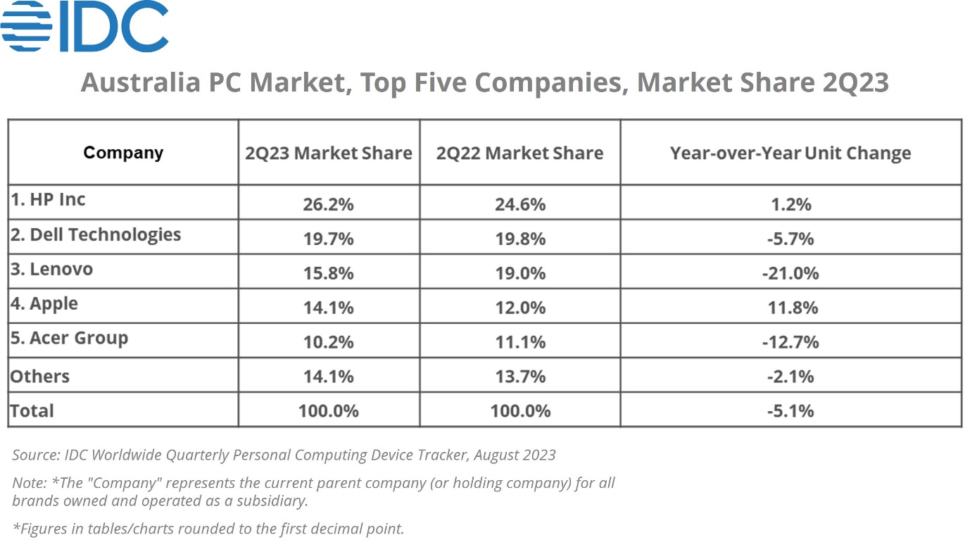 According to the International Data Corporation (IDC) Worldwide Quarterly Personal Computing Device Tracker, Australia’s traditional PC market, inclusive of desktops, notebooks, and workstations, declined by 5.1% YoY in 2Q23 shipping 1,056,969 units.
